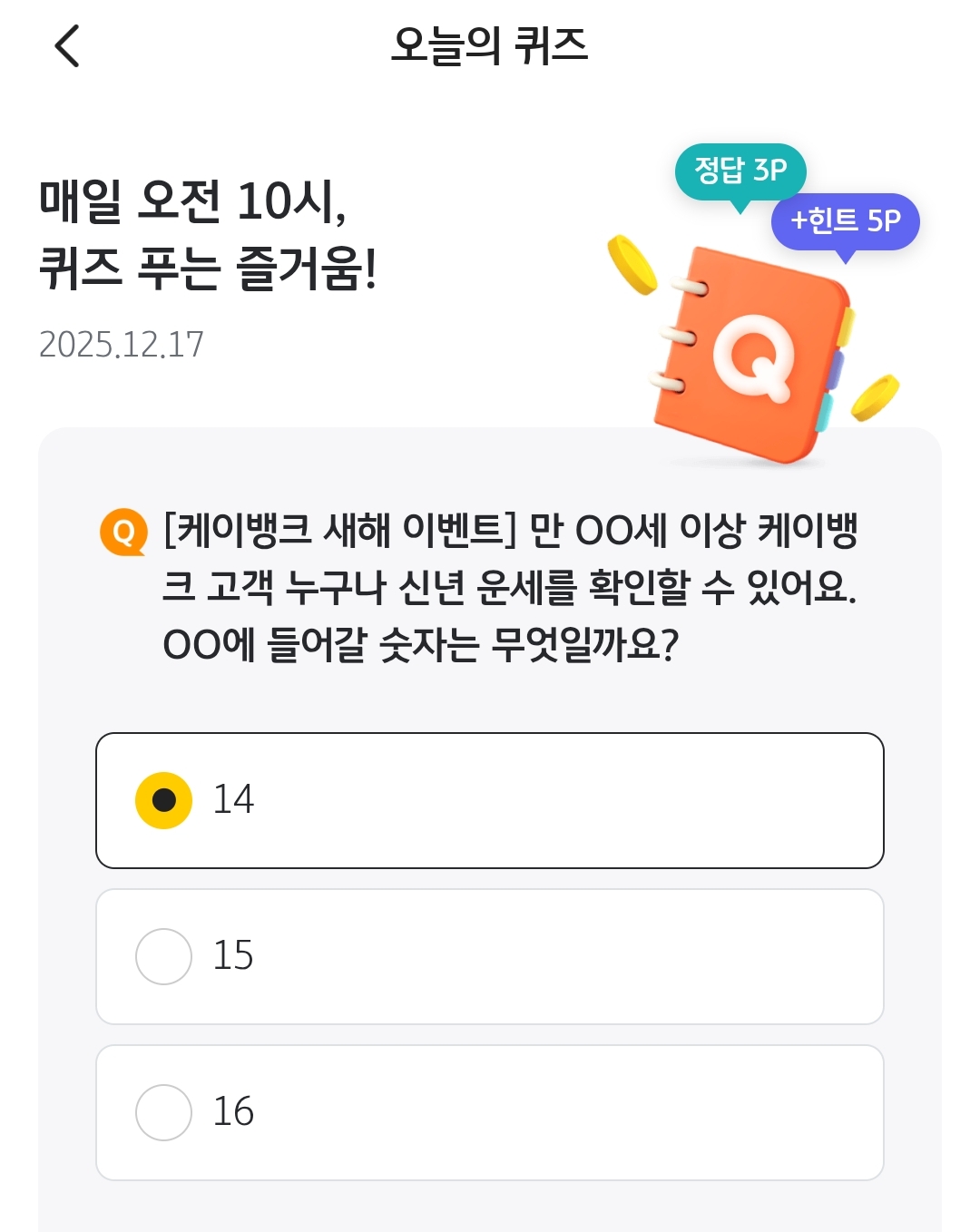 | 오퀴즈 ㅅ ㄱ ㄱ ㅇ 하면 추첨기회 3회 UP! 기간 내 KB Pay 결제하면 2회 추가 UP! (0) | 2025.12.17 |