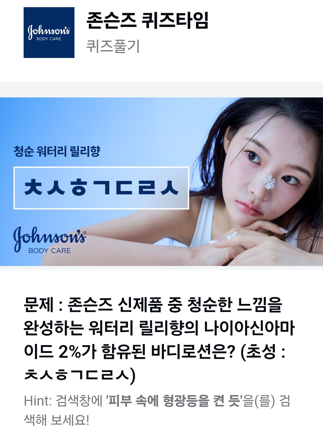 문제 : 존슨즈 신제품 중 청순한 느낌을 완성하는 워터리 릴리향의 나이아신아마이드 2%가 함유된 바디로션은? (초성 : ㅊㅅㅎㄱㄷㄹㅅ)